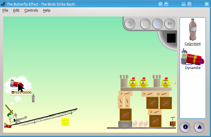 - Many different objects: cola bottles, balloons, butterflies, domino stones, springs, dynamite, seesaws, penguins